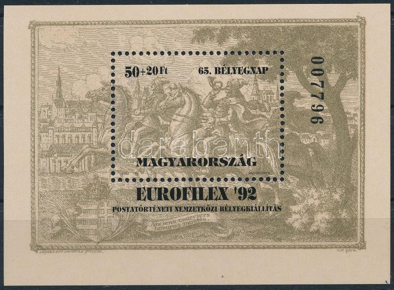 1992 Bélyegnap - Eurofilex eltérő színű sorszámozott blokk NEM FELRAGA... https://www.darabanth.com/de/513-Auktion-Philatelie-Postkarten-Numismatik-Kunstwerke-Bucher-Schreibwaren-Schmuck/513.0/Erlesene-Lose-und-Sammlungen-Ungarn/Einzelne-Gebotslose-Ungarn~1/1992-Belyegnap-Eurofilex-eltero-szinu-sorszamozott-blokk-NEM-FELRAGASZTVA-hibatlan-hatold~II3470765