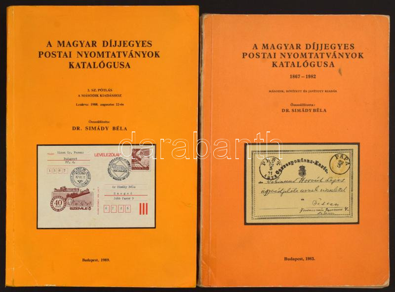 Beschreibung: Dr. Simády Béla: A magyar díjjegyes postai nyomtatványok katalógusa 1867-1982 második, bővített és javított kiadás (Budapest, 1983) + 2. SZ. Pótlás (Budapest, 1989)