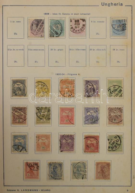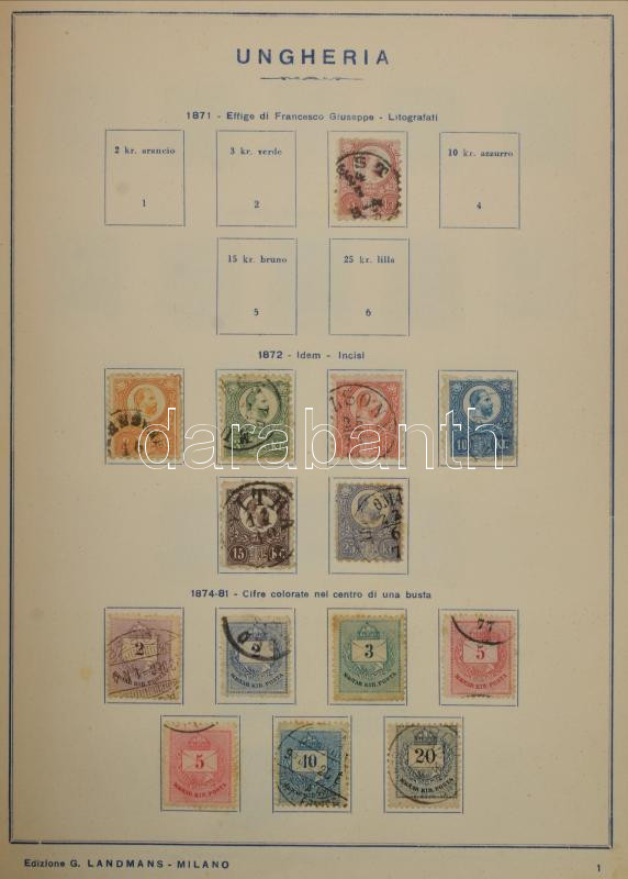 Beschreibung: 1871-1936 Magyar gyűjtemény sorokkal, portókkal, hivatalos bélyegekkel, előnyomott olasz albumban