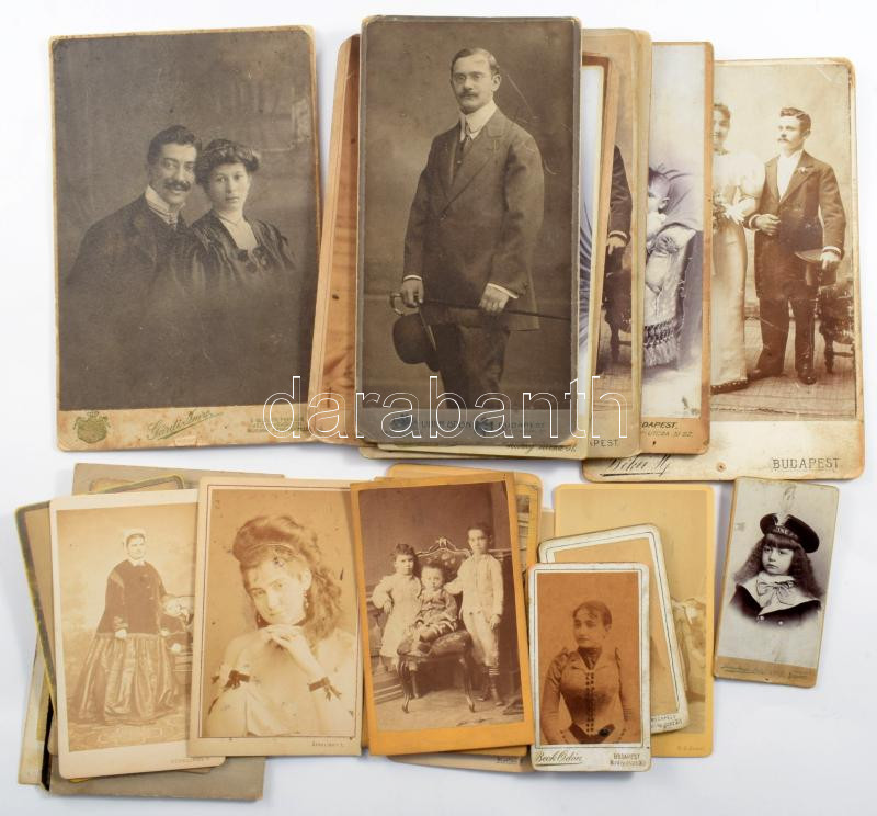 24 db vegyes keményhátú fotó, főként magyar műtermekből (közte Bietler Ferenc, Strelisky Náthán, Klöckner Adél, Schrecker Ignác, stb.), változó méretben és állapotban