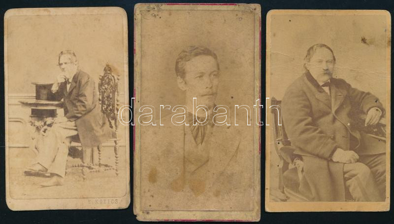 Beschreibung: cca 1865-1875 Férfiportrék, 3 db keményhátú fotó Kozics Ede pozsonyi műterméből, foltosak, 10,5×6,5 cm