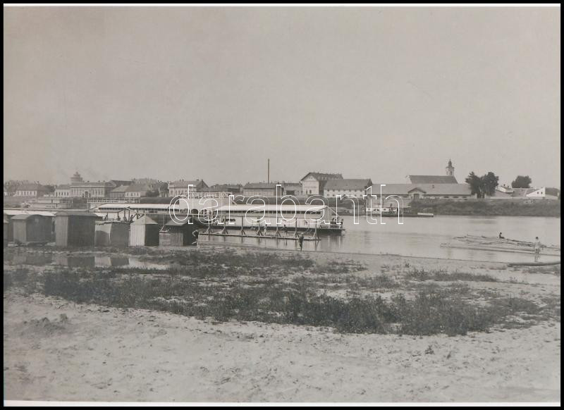 cca 1900 Szeged, a Tiszán úszóházak (strand), a parton öltözőfülkék, a túlparton pedig egy épületen (a gyárkéménytől jobbra) a Pick neve olvasható ki nagyítóval, 1 db modern nagyítás, jelzés nélkül, 15x21 cm