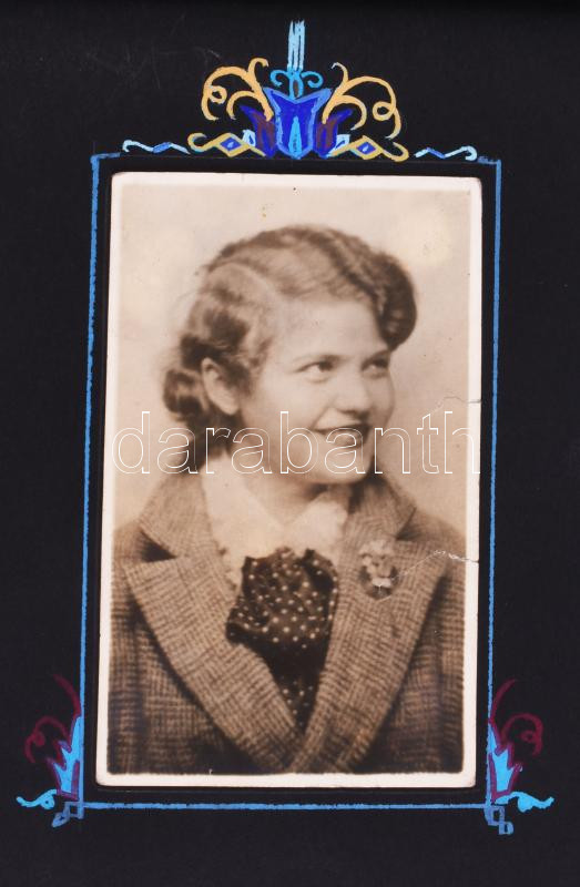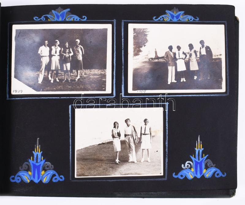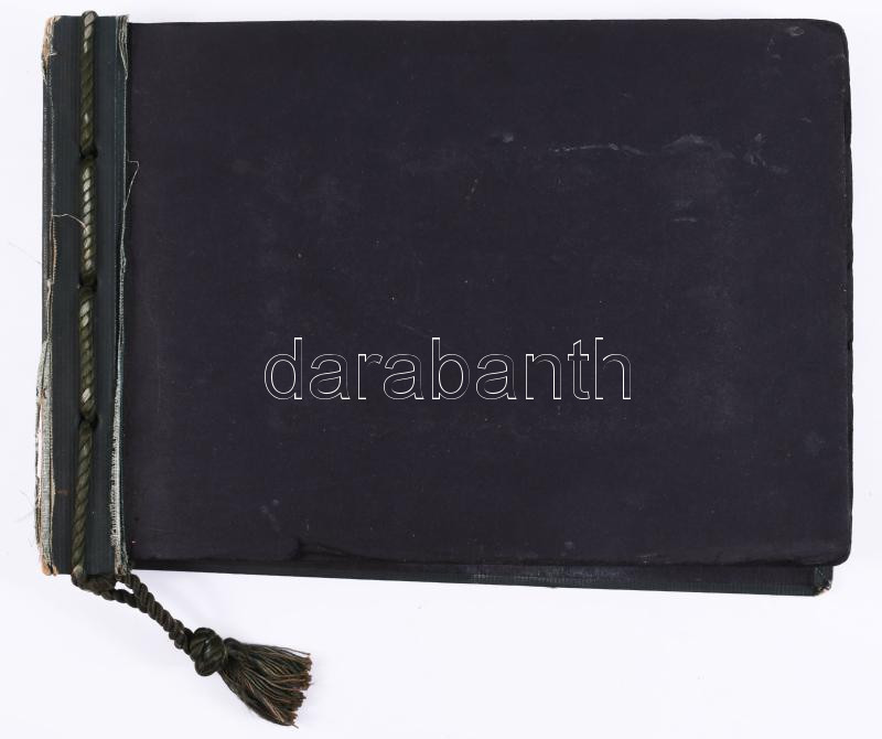 cca 1929-1934 Régi fotóalbum vegyes családi képekkel, összesen kb. 87 db beragasztott fotóval, harántalakú egészvászon-kötésben, sérült, hiányos borítóval, 17,5x25 cm