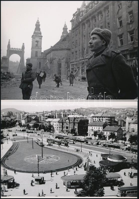 Beschreibung: cca 1945 és 1960 Budapest, orosz katonák az Erzsébet hídnál és vörös csillagos kert a Moszkva téren, 2 db modern nagyítás, jelzés nélkül, 15x21 cm