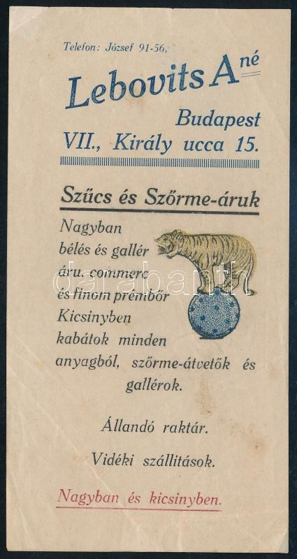 Lebovits szűcs és szőrmeáruk (Bp. VII. Király u.) számolócédula https://www.darabanth.com/de/513-Auktion-Philatelie-Postkarten-Numismatik-Kunstwerke-Bucher-Schreibwaren-Schmuck/513.0/Fotografie/Werbungen~85/Lebovits-szucs-es-szormearuk-Bp-VII-Kiraly-u-szamolocedula~II3472590