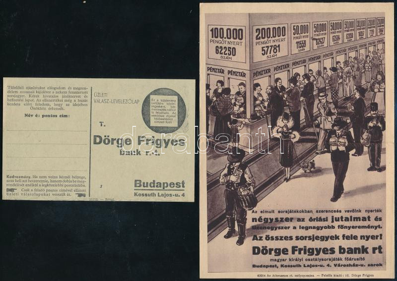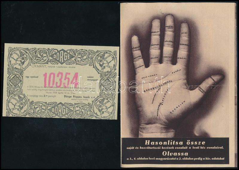 cca 1934 Dörge Frigyes Bank R.T. osztálysorsjáték reklámnyomtatványok,... https://www.darabanth.com/de/513-Auktion-Philatelie-Postkarten-Numismatik-Kunstwerke-Bucher-Schreibwaren-Schmuck/513.0/Fotografie/Werbungen~85/cca-1934-Dorge-Frigyes-Bank-RT-osztalysorsjatek-reklamnyomtatvanyok-2-db~II3472303