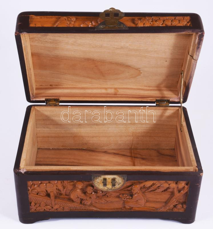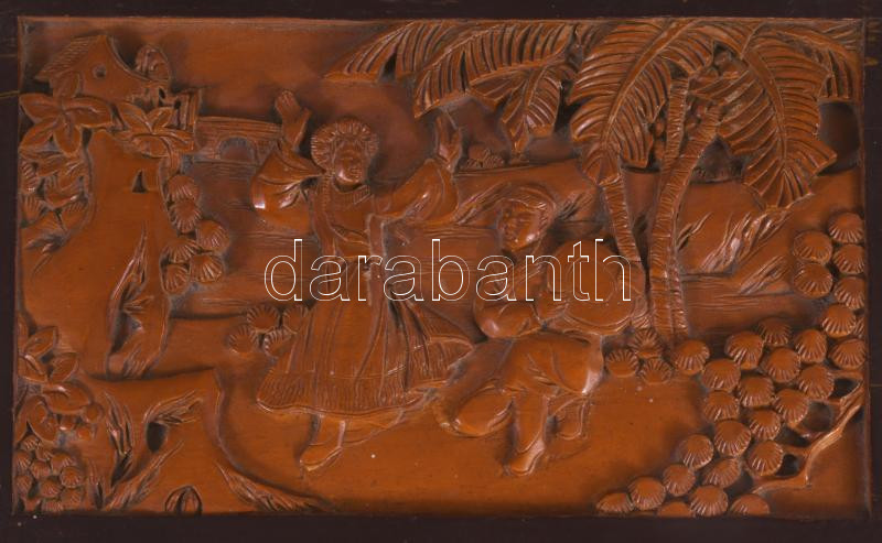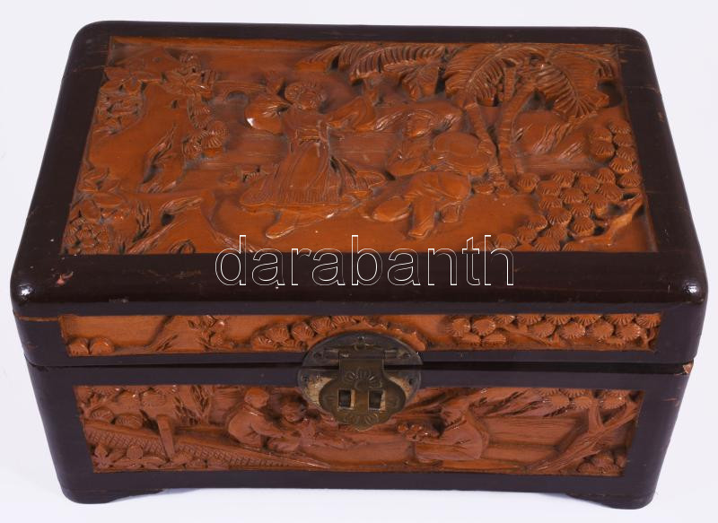 Beschreibung: Kínai faragott fa doboz, sérüléssel, 23x15 cm