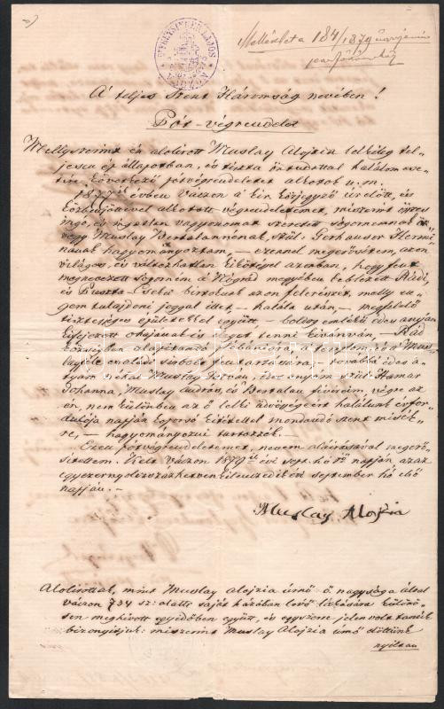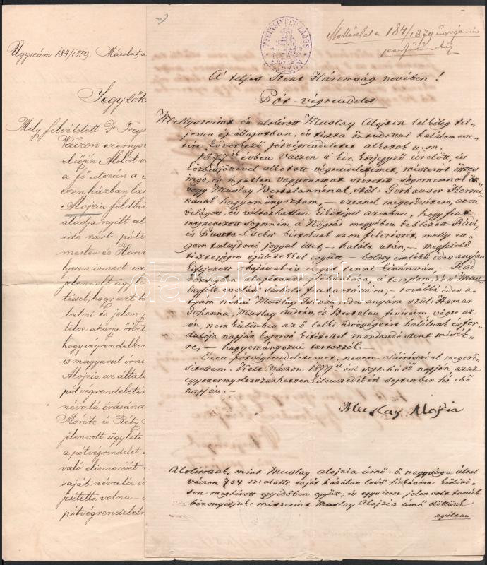 1879 Nemes Muslay Alojzia pótvégrendelete és jegyzőkönyv https://www.darabanth.com/de/513-Auktion-Philatelie-Postkarten-Numismatik-Kunstwerke-Bucher-Schreibwaren-Schmuck/513.0/Kunst-Dokumente-andere-Sammelgebiete/Dokument~80/1879-Nemes-Muslay-Alojzia-potvegrendelete-es-jegyzokonyv~II3468669