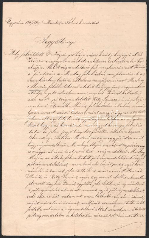 Beschreibung: 1879 Nemes Muslay Alojzia pótvégrendelete és jegyzőkönyv