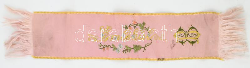 Beschreibung: ,,Emlékül..." virágokkal és monogrammal díszített, hímzett selyem szalag, hajtásnyomokkal, 36x6,5 cm