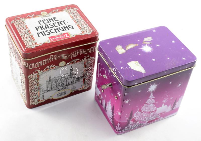 Beschreibung: 2 db zenélő karácsonyi süteményes fémdoboz, az egyiken kopásnyomokkal, 12x9x12 cm