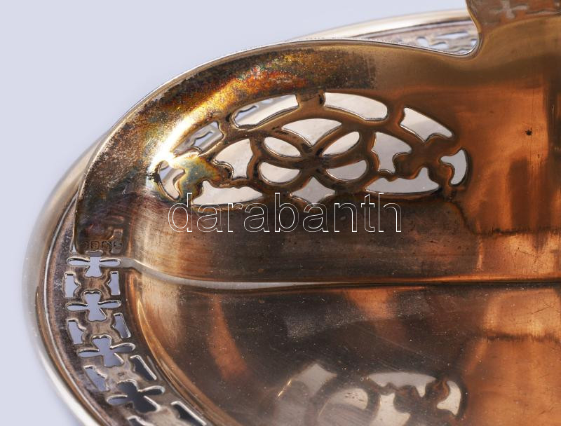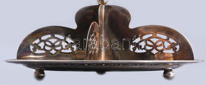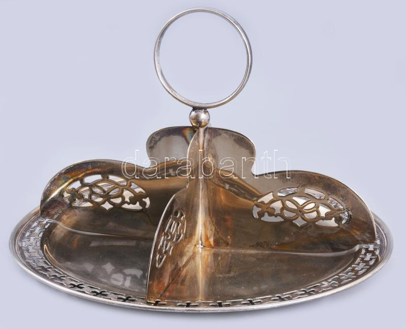Beschreibung: Angol ezüstözött négyosztatú kínáló, 3 darab gömb lábon, áttört díszítéssel, forgatható elosztórésszel, jelzett, 23x17 cm