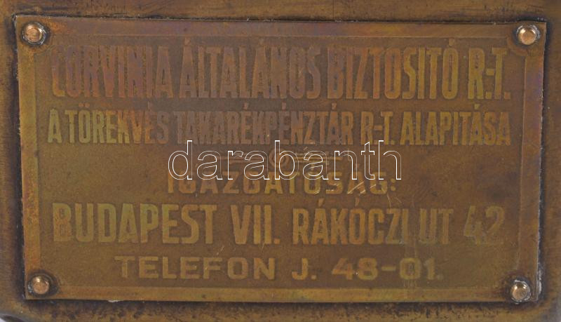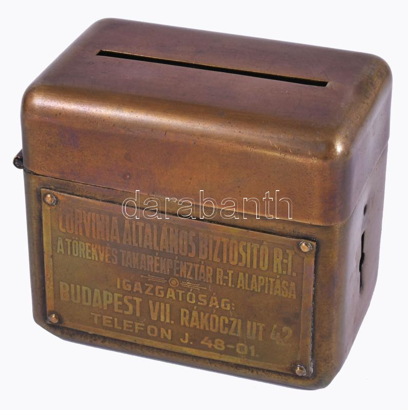 Corvina Általános Biztosító R.T réz persely, 9x7,5 cm https://www.darabanth.com/de/513-Auktion-Philatelie-Postkarten-Numismatik-Kunstwerke-Bucher-Schreibwaren-Schmuck/513.0/Kunst-Dokumente-andere-Sammelgebiete/Flohmarkt~65/Corvina-Altalanos-Biztosito-RT-rez-persely-9x7-5-cm~II3468646