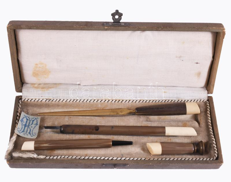 Régi íróasztali készlet, dobozában. https://www.darabanth.com/de/513-Auktion-Philatelie-Postkarten-Numismatik-Kunstwerke-Bucher-Schreibwaren-Schmuck/513.0/Kunst-Dokumente-andere-Sammelgebiete/Flohmarkt~65/Regi-iroasztali-keszlet-dobozaban~II3468734