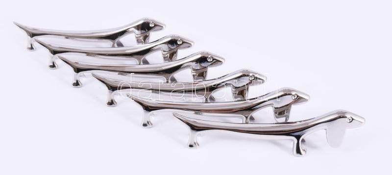 Beschreibung: Stilizált tacskó figurás fém késtámasz szett, 6 darab, h: 9 cm