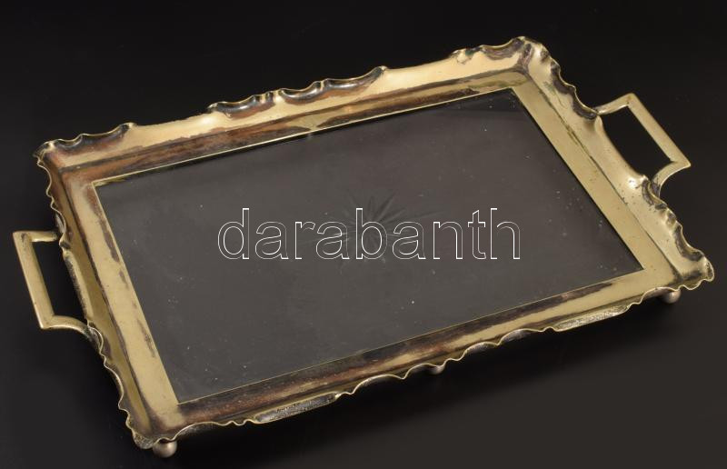 Beschreibung: Századeleji alpakka kínálótálca, csiszolt üveg betéttel, monogrammal, 43x25 cm