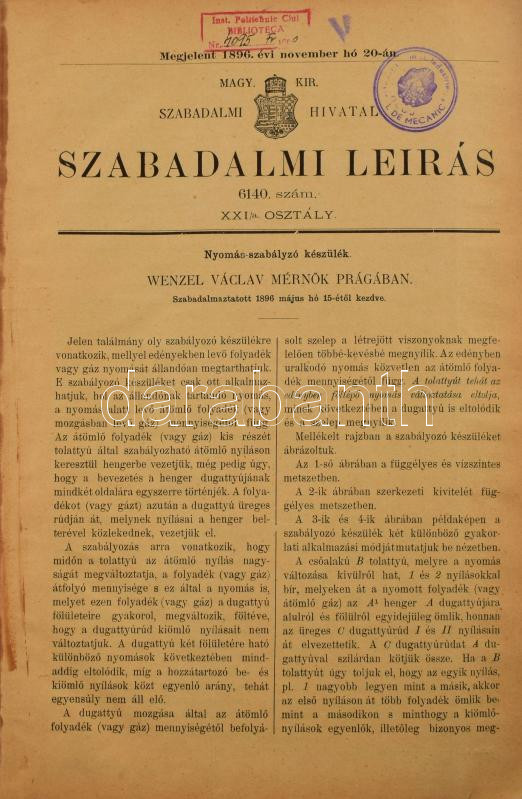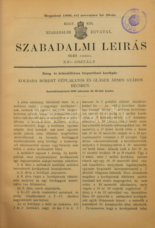 1896 Magy. Kir. Szabadalmi Hivatal, 6140-6213. számú szabadalmi leírás... https://www.darabanth.com/de/513-Auktion-Philatelie-Postkarten-Numismatik-Kunstwerke-Bucher-Schreibwaren-Schmuck/513.0/Kunst-Dokumente-andere-Sammelgebiete/Historische-Dokumenten-Handschriften~81/1896-Magy-Kir-Szabadalmi-Hivatal-6140-6213-szamu-szabadalmi-leirasok-Egybekotve-Felva~II3430069