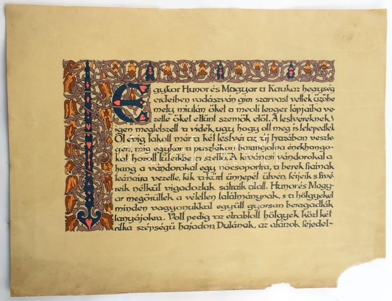 ca 1930 Hunor és Magyar története dekoratív rajzolt emléklap, kódexlap másolat. 42x29 cm