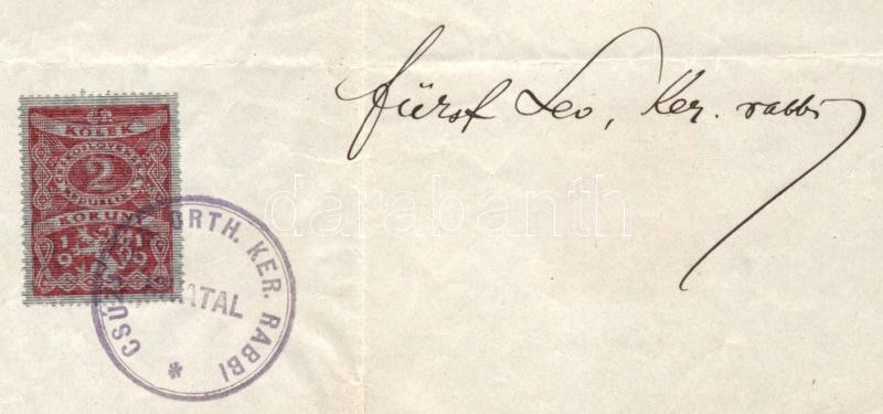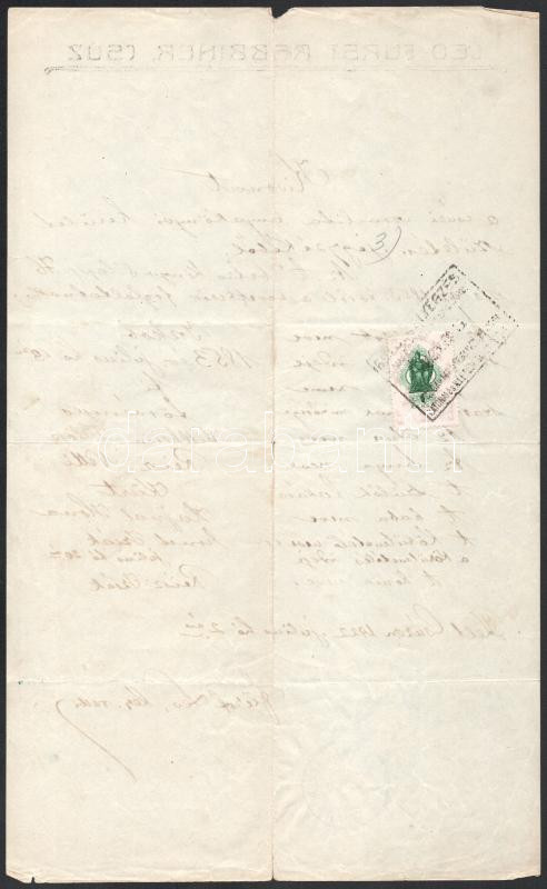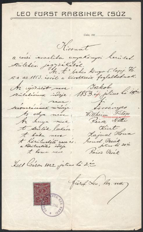Beschreibung: 1922 Csúz (Dubník), kivonat a csúzi izraelita anyakönyvi kerület születési jegyzékéből, Fürst Leo rabbi aláírásával, csehszlovák, illetve a hátoldalon magyar (1P) okmánybélyeggel