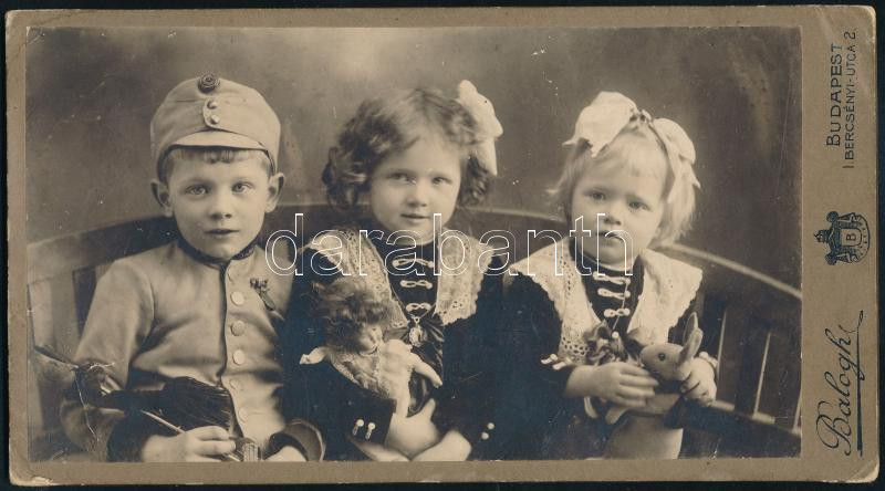 Beschreibung: 1912 Gyerekek (két kislány és egy kisfiú) portréja, a kisfiú katonai egyenruhában, keményhátú fotó Balogh budapesti műterméből, sarkain kissé sérült, 11,5x20,5 cm