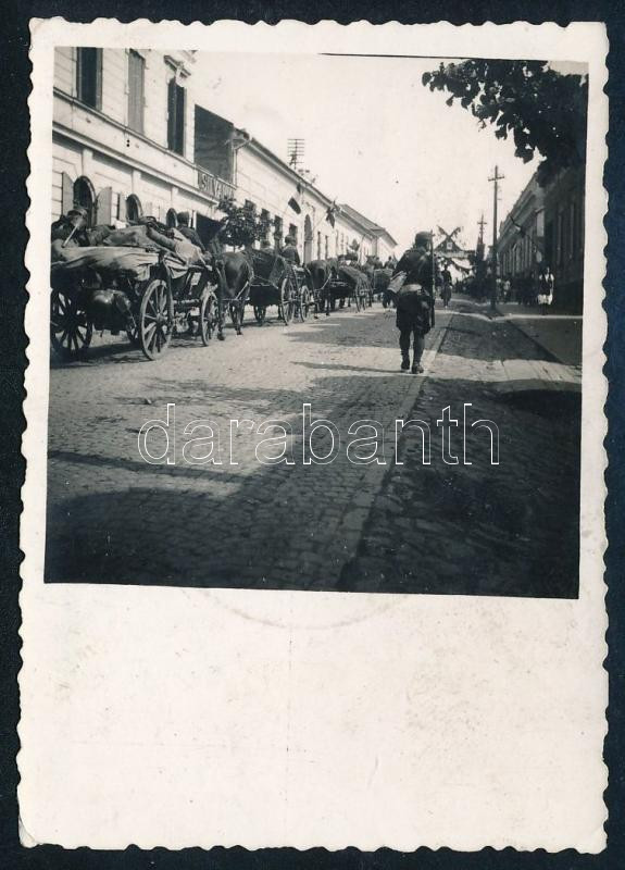 Beschreibung: 1940 A magyar csapatok bevonulása Szilágysomlyóra (Erdély), fotó hátoldalon bélyegekkel és pecsétekkel, jó állapotban, 8,5×6 cm