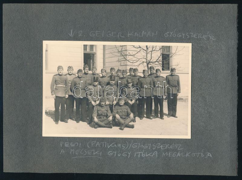 Beschreibung: Geiger Kálmán (1902 - 1990) gyógyszerész a mecseki gyógyitóka megalkotója katonák között, kartonra ragasztott fotó, feliratozva, 9×13,5 cm