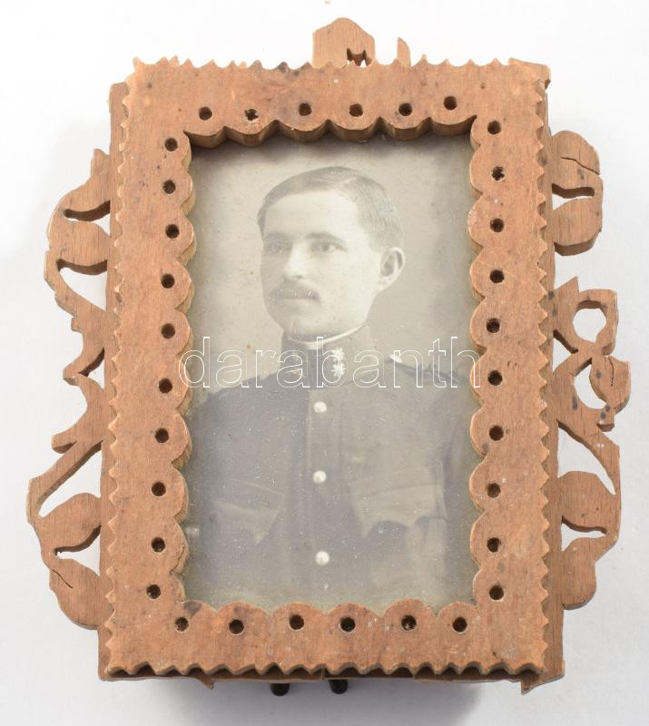 Katonát ábárázoló fotó faragott keretben 12x12 cm https://www.darabanth.com/de/513-Auktion-Philatelie-Postkarten-Numismatik-Kunstwerke-Bucher-Schreibwaren-Schmuck/513.0/Kunst-Dokumente-andere-Sammelgebiete/Militaria~90/Katonat-abarazolo-foto-faragott-keretben-12x12-cm~II3473324