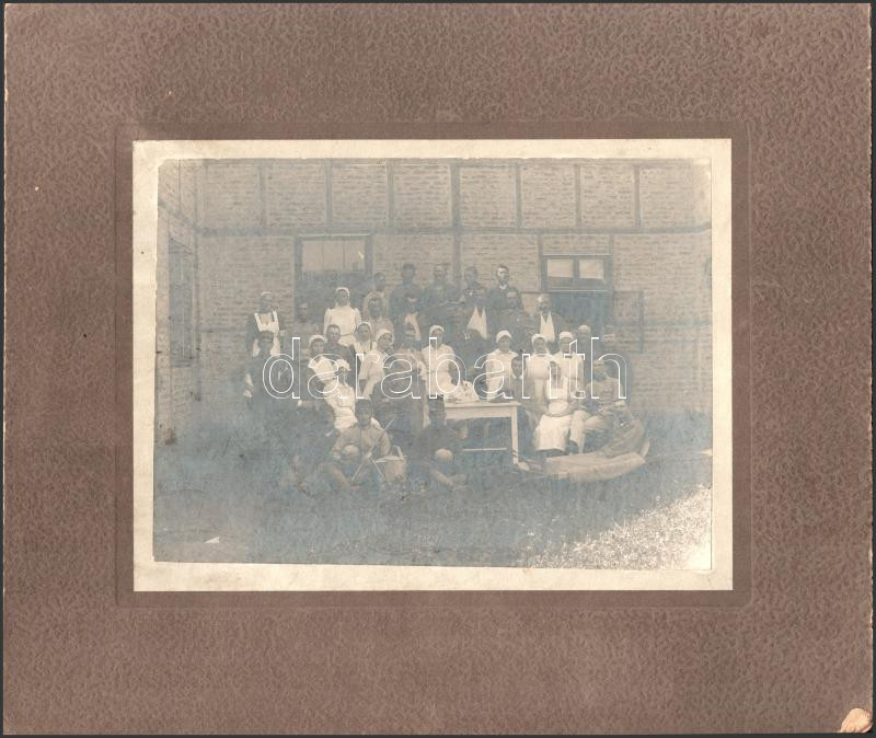 Beschreibung: cca 1917 I. világháborús katonák, ápolók és orvosok csoportképe, kartonra kasírozott fotó, 17×22 cm