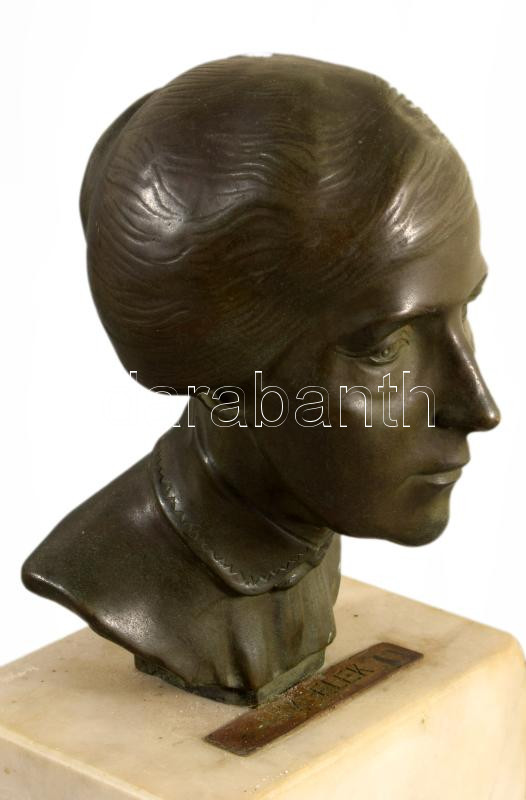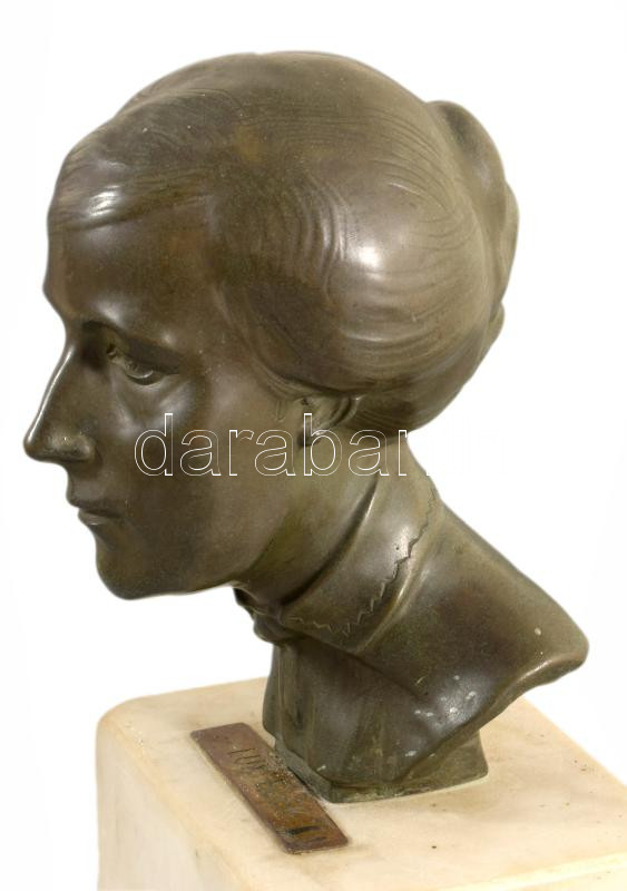 Lux Elek (1884-1941): Női büszt. Feltehetően ón vagy bronz, jelzett a talapzaton, m: 24,5 cm