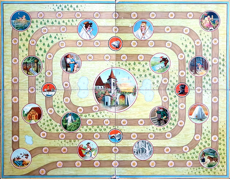 A "Die Reise in's Märchenland' (Utazás Meseországban) címet viselő táblás játék kihajtható, színes játéktáblája. (1920-as évek eleje).