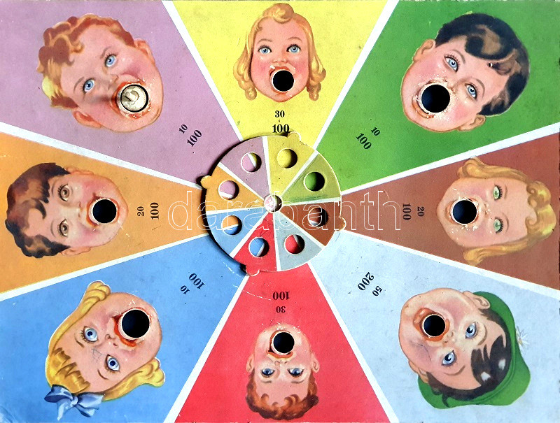 Jó állapotú játéktábla és játékgolyók, Pályi Jenő színes grafikájával illusztrált, enyhén elszíneződött, sérült, hiányos kiadói dobozban.