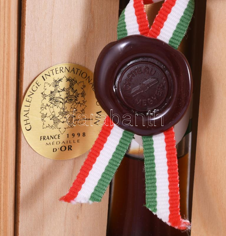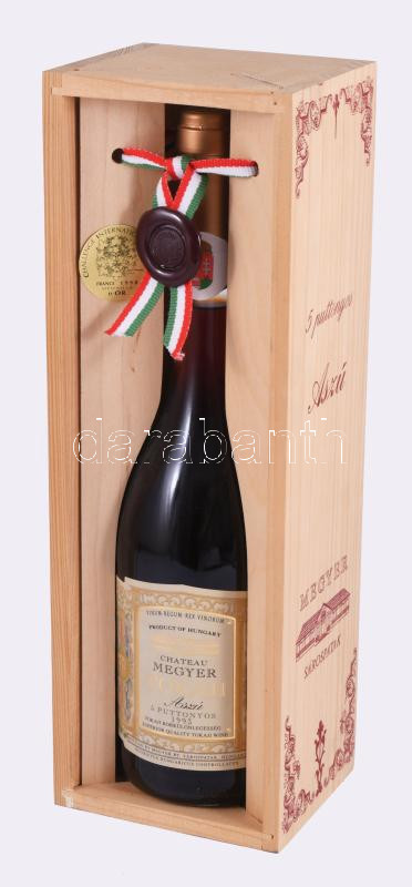 1993 Chateau Megyer 5 puttonyos Tokaji Aszú, bontatlan palack, édes fehér desszertbor, bontatlan, lepecsételt fa díszdobozban, "Challenge International Du Vin France 1998 Médaille d'Or" címkével, 11,5%, 0,5l