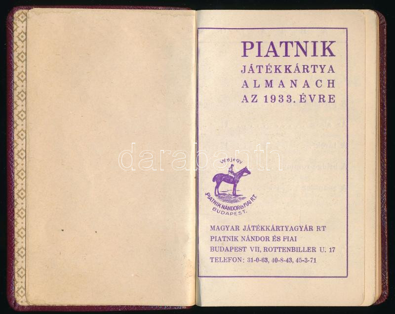 1933 Piatnik Játékkártya Almanach az 1933. évre, zsebnaptár https://www.darabanth.com/de/513-Auktion-Philatelie-Postkarten-Numismatik-Kunstwerke-Bucher-Schreibwaren-Schmuck/513.0/Kunst-Dokumente-andere-Sammelgebiete/Werbungen~85/1933-Piatnik-Jatekkartya-Almanach-az-1933-evre-zsebnaptar~II3471166