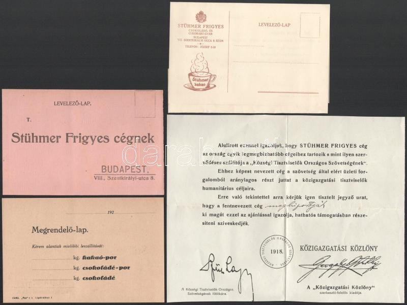 Beschreibung: cca 1920 Stühmer Frigyes csokoládégyár 5 db reklám nyomtatvány, fejléces levélpapír, stb.