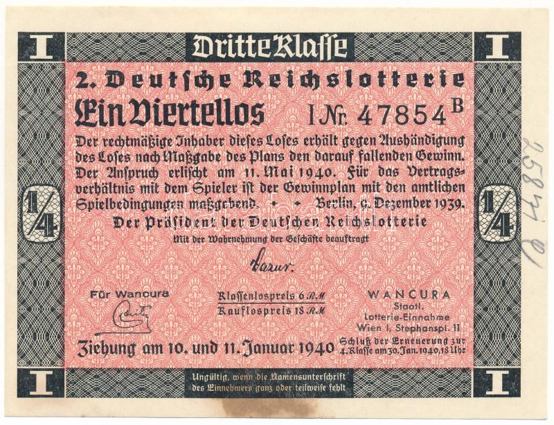 Német Harmadik Birodalom 1940. "2. Deutsche Reichslotterie (2. Német Birodalmi Sorsjáték)" 3. osztály 1/4 sorsjegye, vízjeles papíron, sorszámozással T:XF hajtatlan, folt