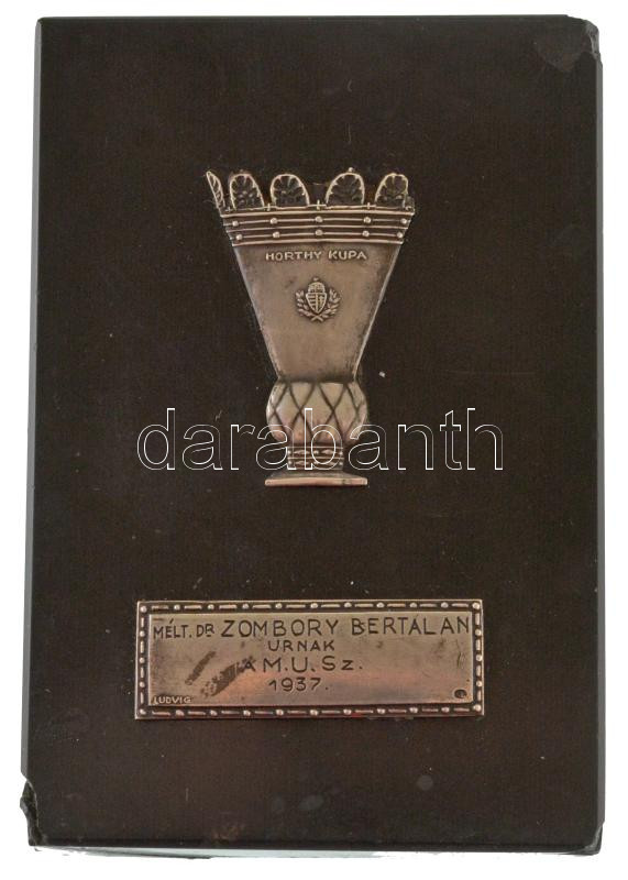 1937. "Horthy Kupa" jelzetlen Ag kupa formájú lemezplakett (25x40mm) és "Mélt. Dr. Zombory Bertalan úrnak a MUSZ 1937." jelzett Ag lemezplakett "Ludvig" gyártói jelzéssel (44x15mm) fekete márványtalapzaton (73x109x20mm) T:XF márványon kisebb sérülések