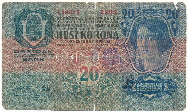 Beschreibung: 1913. 20K I. kiadás, hamis(?) felülbélyegzéssel T:G