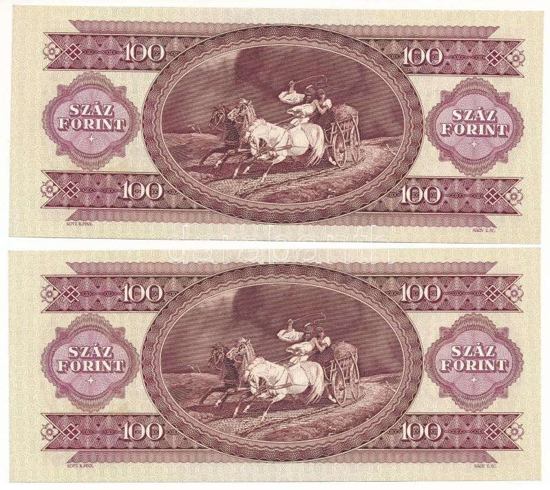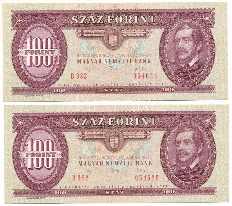 Beschreibung: 1992. 100Ft (2x) sorszámkövetők "B 382 054624 - B 382 054625" az egyik nyomdai festékfoltokkal T:UNC
