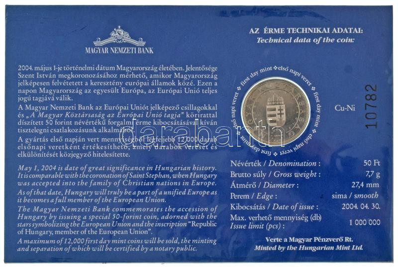 Beschreibung: 2004. 50Ft Cu-Ni "Európai Uniós csatlakozás " elsőnapi veret alacsonyabb, "10782"es sorszámmal T:UNC