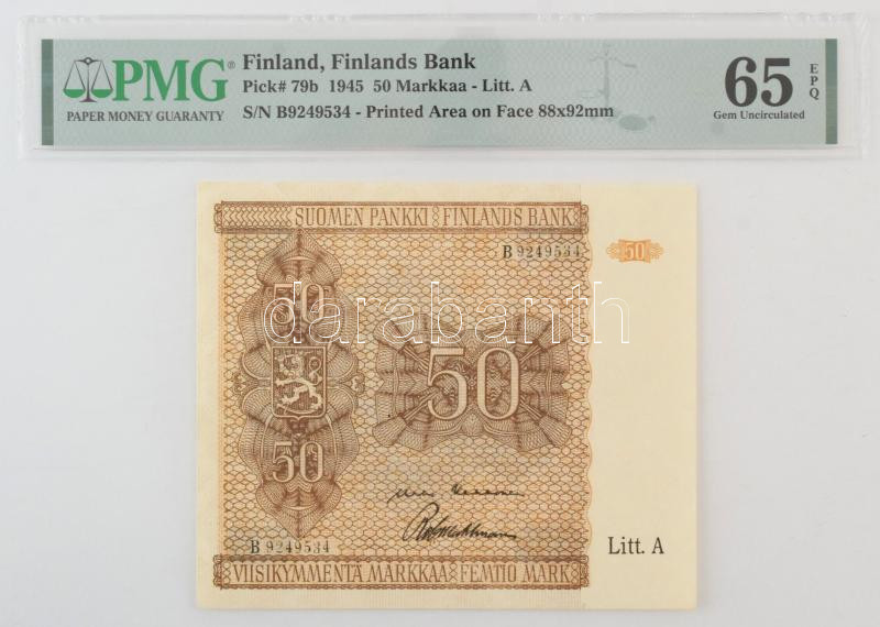 Finnország 1945. 50M "B 9249534" levágott PMG tanúsítvánnyal... https://www.darabanth.com/de/513-Auktion-Philatelie-Postkarten-Numismatik-Kunstwerke-Bucher-Schreibwaren-Schmuck/513.0/Numismatik/Weltweit-Banknoten~723/Finnorszag-1945-50M-B-9249534-levagott-PMG-tanusitvannyal-TAU3Cbr-3E-Finland-1945-50-Markk~II3465267