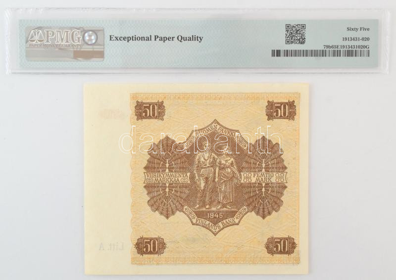 Beschreibung: Finnország 1945. 50M "B 9249534" levágott PMG tanúsítvánnyal T:AU