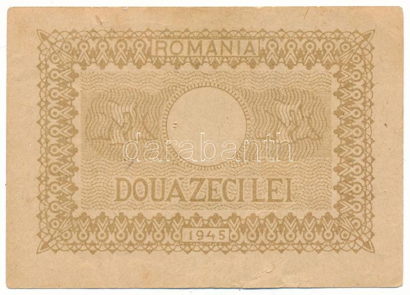 Krause P#76 https://www.darabanth.com/de/513-Auktion-Philatelie-Postkarten-Numismatik-Kunstwerke-Bucher-Schreibwaren-Schmuck/513.0/Numismatik/Weltweit-Banknoten~723/Romania-1945-20L-TF3Cbr-3E-Romania-1945-20-Lei-CF3Cbr-3E-Krause-P2376~II3470512