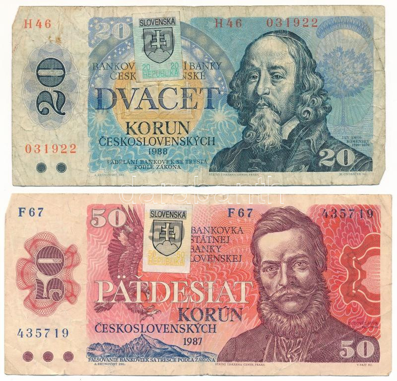 Slovakia 1993. 20 Korun with Slovakian stamp on Czechoslovakian 1988. 20 Korun "H 46 031922" banknote + 1987. 50 Korun "F 67 435719" with Slovakian stamp on Czechoslovakian 1987 50 Korun banknote C:F,VG