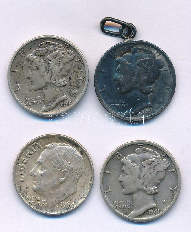 Amerikai Egyesült Államok 1936-1944 1d Ag "Mercury" (3xklf, egyik medálnak megcsinálva) + 1964. 1d Ag "Roosevelt" T:XF-F patina
