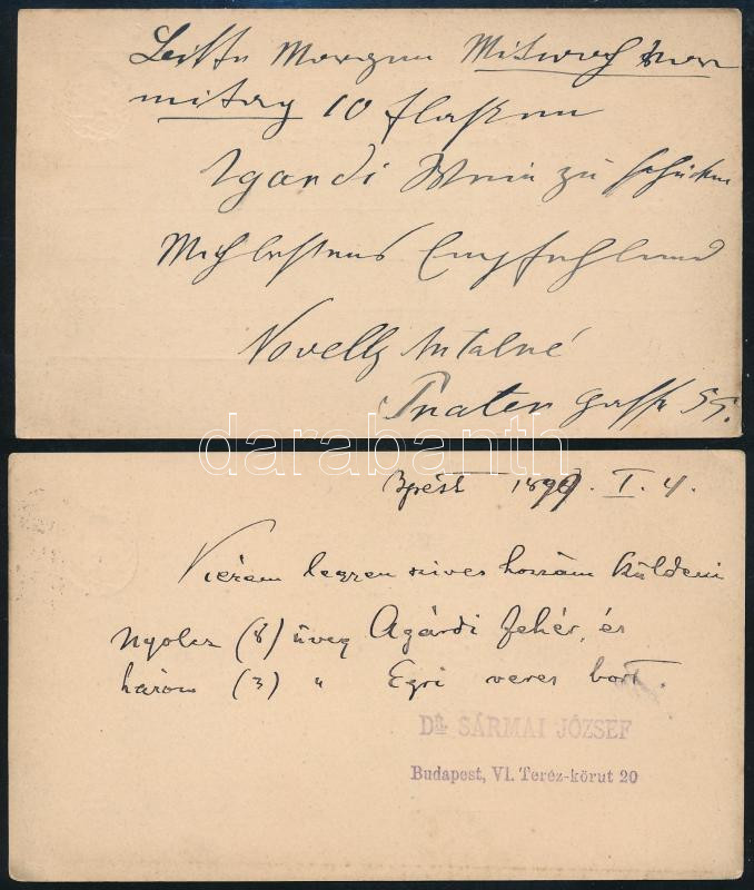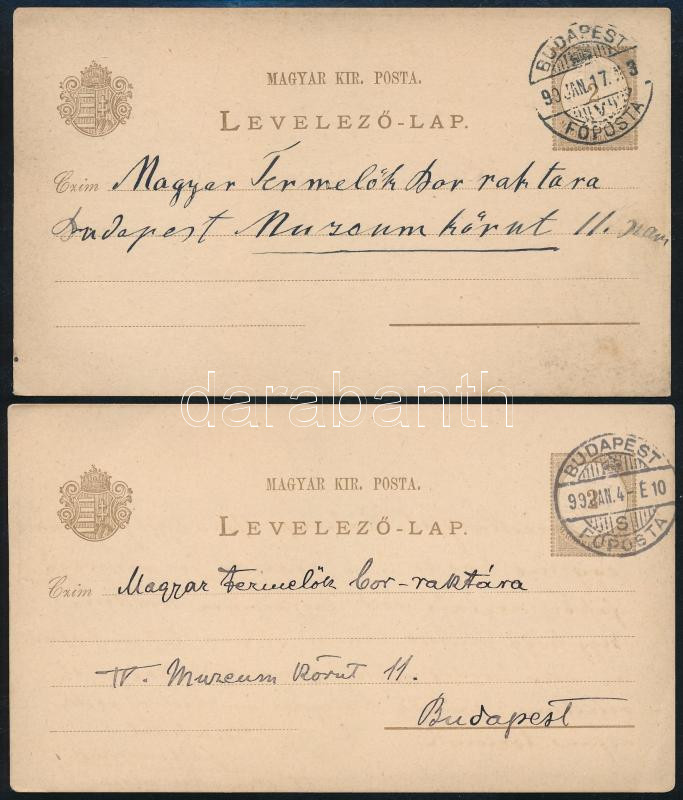 1899 2 db 2kr díjjegyes levelezőlap a Magyar Termelők Bor-raktárának címezve