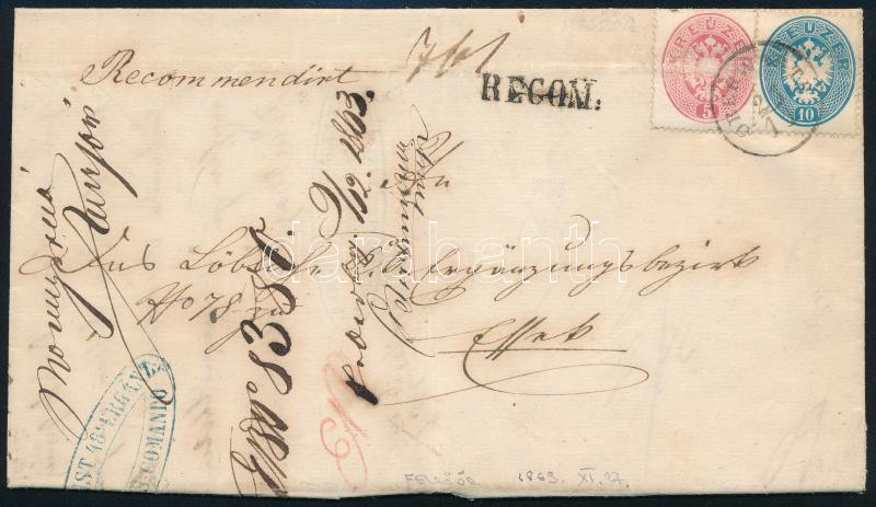 1863 5kr + 10kr ajánlott levélen (hajtottak) / 5kr + 10kr on registere... https://www.darabanth.com/de/513-Auktion-Philatelie-Postkarten-Numismatik-Kunstwerke-Bucher-Schreibwaren-Schmuck/513.0/Philatelie-und-Postgeschichte-Ungarn/Briefmarkenausgabe-1863~19/1863-5kr-plus-10kr-ajanlott-levelen-hajtottak-5kr-plus-10kr-on-registered-cover-folded-OBERWARTH~II2849118