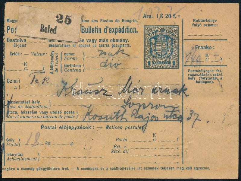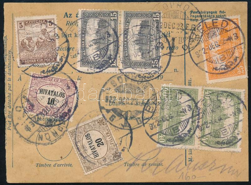 1922 Csomagszállító 8 db bélyeggel bérmentesítve, közte 2 db Hivatalos "BELED"
