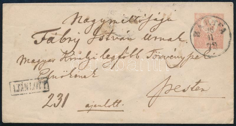 Beschreibung: 1872 5kr díjjegyes levelezőlap látványosan elfogazott Réznyomat 10kr (bontásnál eltépve / torn apart) díjkiegészítéssel ajánlott küldeményként feladva "BÁRTFA" - Pest