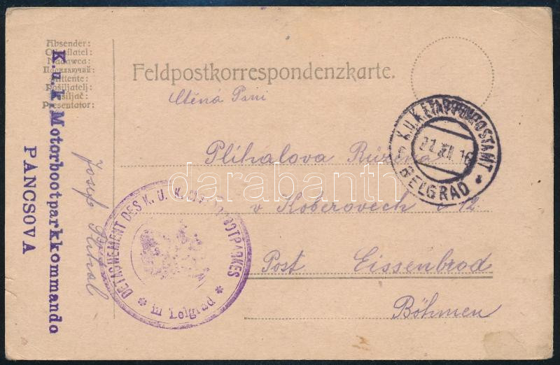 Beschreibung: 1916 Tábori posta levelezőlap "K.u.K. ETTAPENPOST BELGRAD" , "DETACHEMENT DES K.U.K. MOTORBOOTPARKES / im Belgrad" , "K.u.k. Motorbootparkkommando / PANCSOVA"
