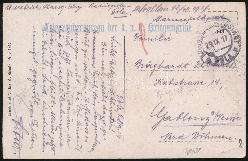 1917 Tábori posta képeslap / Field postcard "Telegraphenbureau de... https://www.darabanth.com/de/513-Auktion-Philatelie-Postkarten-Numismatik-Kunstwerke-Bucher-Schreibwaren-Schmuck/513.0/Philatelie-und-Postgeschichte-Ungarn/Osterreich-Ungarische-Feldpost-Erster-Weltkrieg-Marine~36/1917-Tabori-posta-kepeslap-Field-postcard-Telegraphenbureau-der-kuk-kriegsmarine~II3472240